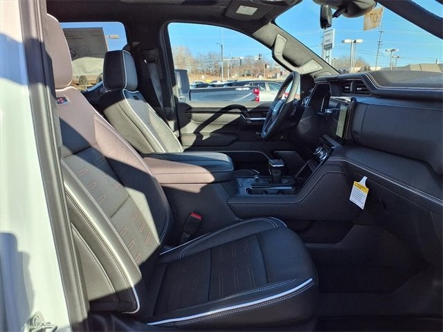 10-Speed Automatic, 4WD, Obsidian Rush Leather, 12 Speakers, 120-Volt Bed Mounted Power Outlet, 120-Volt Interior Power Outlet, 16-Way Power Driver Seat Adjuster w/Lumbar, 16-Way Power Passenger Seat Adjuster w/Lumbar, 170 Amp Alternator, 2 Charge/Data USB Ports Inside Center Console, 2 Type-C Charge-Only Rear USB Ports, 2 USB Ports, 220 Amp Alternator, 3.23 Rear Axle Ratio, 4-Wheel Disc Brakes, ABS brakes, Air Conditioning, Alloy wheels, AM/FM radio: SiriusXM with 360L, Apple CarPlay/Android Auto, Auto High-beam Headlights, Auto-dimming door mirrors, Auto-dimming Rear-View mirror, Automatic Emergency Braking, Automatic temperature control, Auxiliary External Transmission Oil Cooler, Bed View Camera, Block heater, Bose Premium Series w/12-Speaker System, Brake assist, Buckle to Drive, Color-Keyed Carpeting Floor Covering, Compass, Deep-Tinted Glass, Delay-off headlights, Driver door bin, Driver Memory, Driver vanity mirror, Driver-Selectable Full-Locking Front Differential, Driver-Selectable Full-Locking Rear Differential, Dual Active Exhaust, Dual front impact airbags, Dual front side impact airbags, Electric Rear-Window Defogger, Electronic Stability Control, Emergency communication system: OnStar, External Engine Oil Cooling, Floor-Mounted Center Console, Following Distance Indicator, Forward Collision Alert, Front anti-roll bar, Front Bucket Seats, Front Center Armrest, Front dual zone A/C, Front fog lights, Front License Plate Kit, Front Pedestrian Braking, Front Prem Floor Liners w/Removable Carpet Insert, Front Rain-Sensing Wipers, Front reading lights, Front wheel independent suspension, Full Grain Leather Seat Trim, Fully automatic headlights, Garage door transmitter, Genuine wood dashboard insert, Genuine wood door panel insert, Gloss Black Header w/Drk Nickel Grille Insert Bars, GMC MultiPro Tailgate Step Lights (LPO), HD Surround Vision, Heads-Up Display, Heated 2nd Row Outboard Seats, Heated door mirrors, Heated Driver & Front Outboard Passenger Seating, Heated front seats, Heated rear seats, Heated steering wheel, Heavy-Duty Air Filter, Hill Descent Control, Hitch Guidance, Hitch View, Illuminated entry, In-Vehicle Trailering System App, Integrated Trailer Brake Controller, IntelliBeam Automatic High Beam On/Off, Keyless Open & Start, Lane Keep Assist w/Lane Departure Warning, Leather steering wheel, LED Cargo Area Lighting, Low tire pressure warning, Memory seat, Multicolor 15 Diagonal Head-Up Display, MultiPro Tailgate Audio System by Kicker (LPO), Navigation System, Occupant sensing airbag, Off-Road High Clearance Step (LPO), Off-Road Suspension, OnStar Services Capable, Outside temperature display, Overhead airbag, Overhead console, Panic alarm, Passenger door bin, Passenger vanity mirror, Perimeter Lighting, Power Door Locks, Power door mirrors, Power driver seat, Power Front Passenger Windows w/Express Up/Down, Power Front Windows w/Driver Express Up/Down, Power moonroof, Power passenger seat, Power Rake & Telescoping Steering Column, Power Rear Windows w/Express Down, Power Sliding Rear Window w/Rear Defogger, Power steering, Power Sunroof, Power windows, Preferred Equipment Group 4SG, Push Button Start, Radio data system, Radio: Premium GMC Infotainment Audio System, Rain sensing wipers, Rear Cross Traffic Braking, Rear Pedestrian Detection, Rear Prem Floor Liners w/Removable Carpet Insert, Rear reading lights, Rear seat center armrest, Rear step bumper, Rear Wheelhouse Liners, Rear window defroster, Remote keyless entry, Remote Vehicle Starter System, Safety Alert Seat, Security system, SiriusXM w/360L Trial Subscription, Speed control, Speed-sensing steering, Split folding rear seat, Spray-On Pickup Bedliner w/GMC Logo, Steering Wheel Audio Controls, Steering wheel mounted a